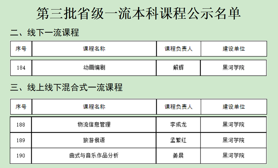本网讯(特约记者 王虹丹)近日,黑龙江省教育厅发布《关于第三批省级一流本科课程认定结果的公示》,我校四门课程被认定为省级一流本科课程,其中《动画编剧》为线下一流课程,《物流信息管理》《旅游俄语》《曲式与音乐作品分析》三门为线上线下混合式一流课程。此次,黑龙江省教育厅共认定第三批省级一流本科课程505门。至此,我校共获批13门省级一流课程,其中线上一流课程2门、线下一流课程3门、线上线下混合式一流课程6门、社会实践一流课程1门、虚拟仿真实践课程1门。