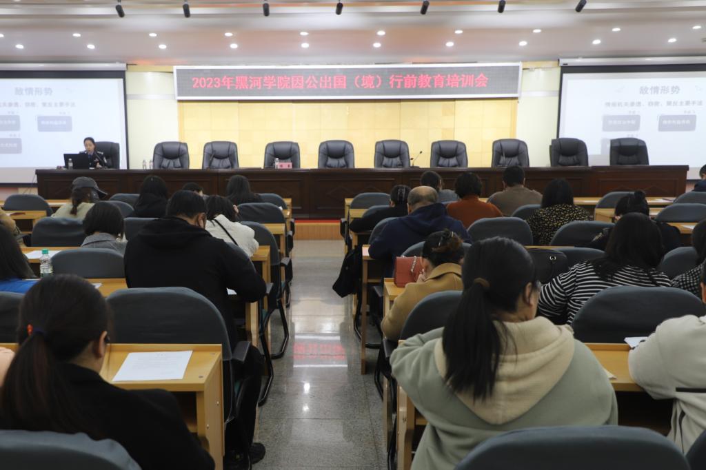 10月18日,学校在明德楼五楼多功能厅举办2023年黑河学院出国(境)行前安全教育培训会,学校党委委员、副院长谢慧同各职能部门、各学院121名教师共同聆听了黑河市国家安全局工作人员对安全防卫教育、国家安全教育、保密安全教育等方面的详细讲解,进一步加强因公出国教师的政治安全意识、外事纪律、保密意识、工作生活作风和个人安全防范意识,增强保障国家安全的自觉性和警惕性。