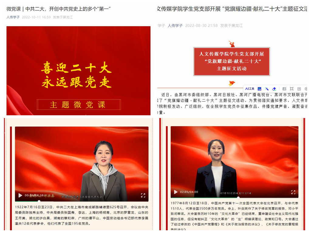 2022年5月至二十大召开前期,2020级和2021级学生宣讲团成员,利用“人传学子”微信公众号,开设“喜迎二十大 永远跟党走”主题微党课专栏,以视频宣讲形式回顾党的历次代表大会,共录制微党课视频6期,并开展“党旗耀边疆·献礼二十大”主题征文活动、“最美中国红 喜迎二十大”红色观影活动等,强化氛围营造,传播党建声音,用实际行动践行初心使命,喜迎党的二十大胜利召开。