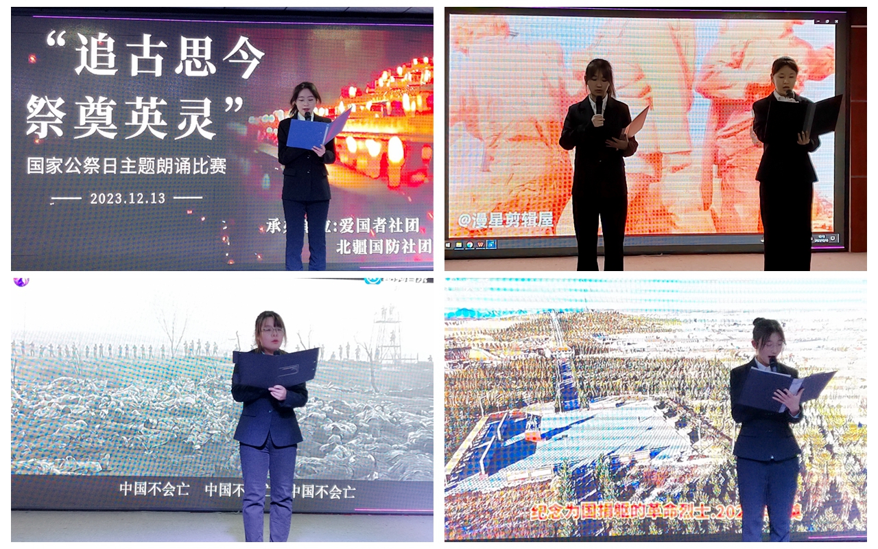 国家公祭日主题朗诵祭英灵活动,让同学们经历了一场深刻的爱国主义教育洗礼,在缅怀革命先烈和遇难同胞的同时,激励大家牢记历史、凝聚力量、砥砺前行,增强自身的社会责任感、国家荣辱感和民族使命感。参赛同学们纷纷表示,作为一个有理想、有担当的大学生,应铭记历史,不忘国耻、国殇,珍爱和平,牢记使命担当,肩负起新时代的重任,以壮美青春投入新的和平伟业。