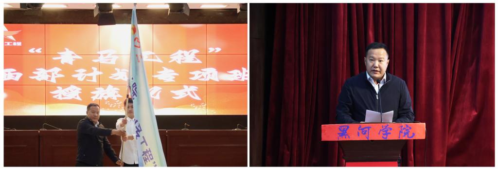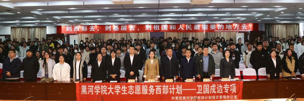 校党委副书记姜国玉为我校“青马工程” 西部计划专项班学员代表授旗。他强调,广大青年要以“卫国戍边”精神为引领,持续讲好黑河学院“育人戍疆”故事,积极投身边疆建设,将远大理想和人生价值“种”在祖国边疆,带着把边疆当故乡的情怀和把群众当亲人的作风,用实际行动作答“大我”和“小我”的选择题,将个人理想融入家国需要,用无悔的青春选择、青春奉献书写新时代的戍边故事,努力在中华民族伟大复兴的进程中谱写戍边兴边、荣校报国的新篇章,为建设社会主义现代化国家贡献青春力量。