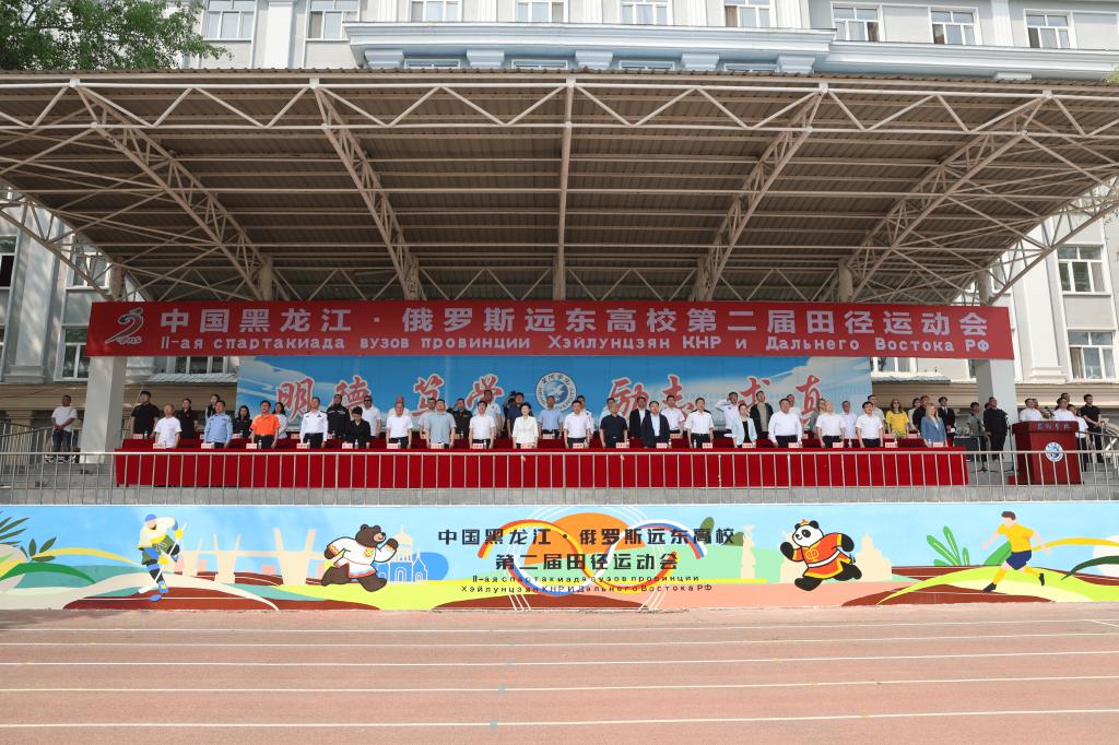 本网讯(记者 太译彬 陈虹旭)5月29日,由黑龙江省教育厅指导,黑龙江省学生体育协会主办,黑河学院承办的中国黑龙江·俄罗斯远东高校第二届田径运动会暨黑河学院第十七届田径运动会开幕式在我校体育场举行。来自俄罗斯布拉戈维申斯克国立师范大学、阿穆尔国立大学、远东国立农业大学、太平洋国立大学、肖洛姆•阿莱赫姆国立大学,哈尔滨工业大学、首都体育学院、哈尔滨理工大学、黑龙江八一农垦大学、哈尔滨体育学院、黑龙江工程学院、哈尔滨金融学院、大庆师范学院、绥化学院、黑龙江东方学院、黑龙江省冰雪体育职业学院、黑龙江护理高等专科学校及我校共18所中俄高校的千余名运动员齐聚一堂,以体育为媒,以梦想为帆,共同开启中俄青年友谊之旅。