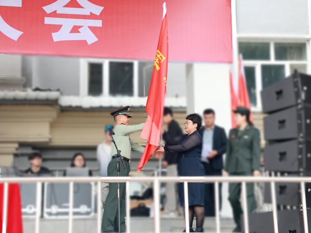 随着国歌奏响,五星红旗在运动场冉冉升起,全体人员肃立行注目礼,大会在庄严的升旗仪式中拉开序幕。带队教官随后宣读《黑河学院2025级新生军训计划》及《考核评比办法》,从军事技能训练到国防理论学习,详细部署军训期间的教学安排与考核标准,为新生明确训练方向。授旗环节中,承训部队领导向谢慧授予"军训大队旗",谢慧依次为各学院授"军训中队旗"。