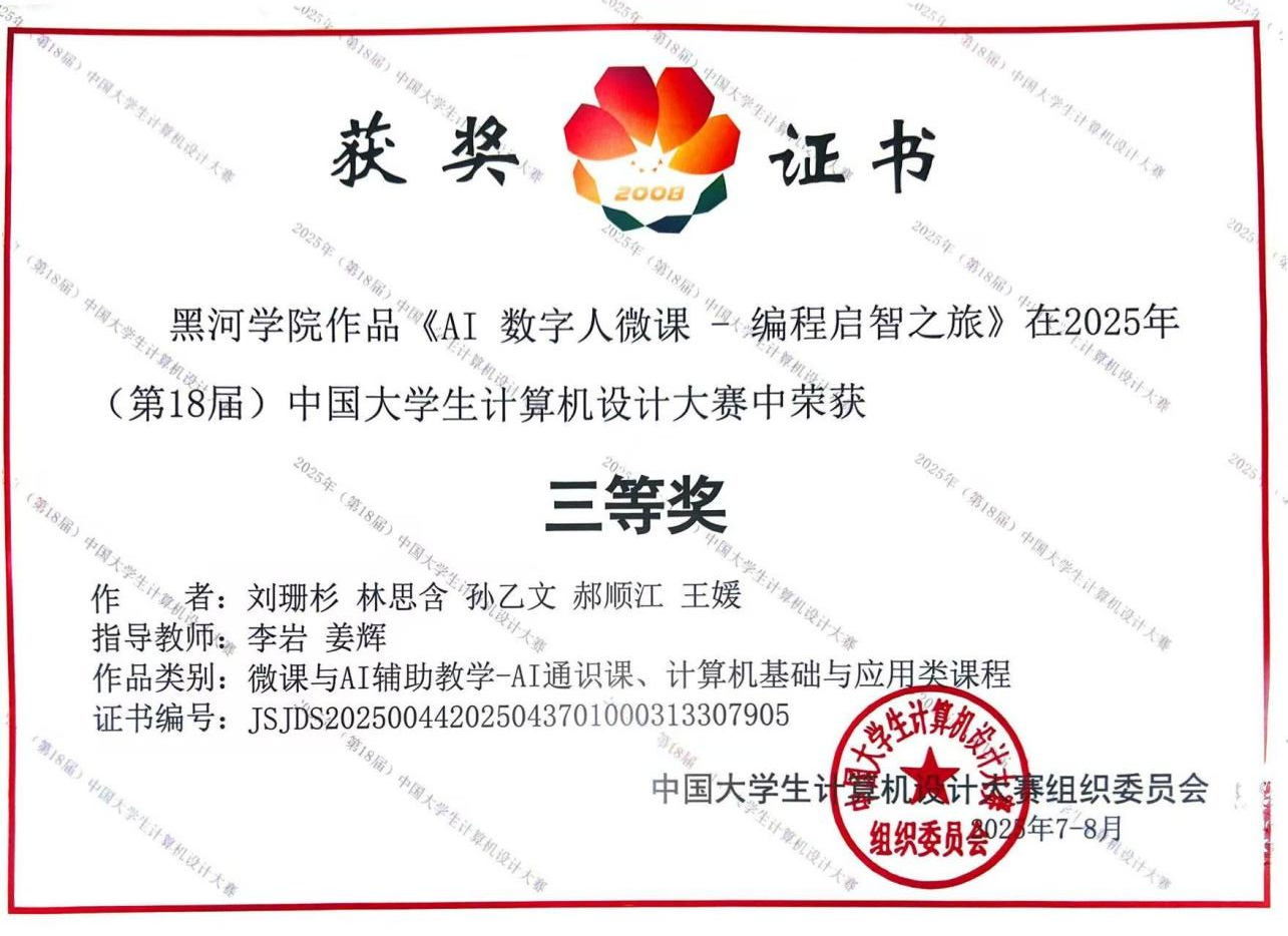 近日,2025年(第18届)中国大学生计算机设计大赛结果揭晓,学校学子刘珊杉等同学完成的项目《AI数字人微课-编程启智之旅》成功斩获全国三等奖。