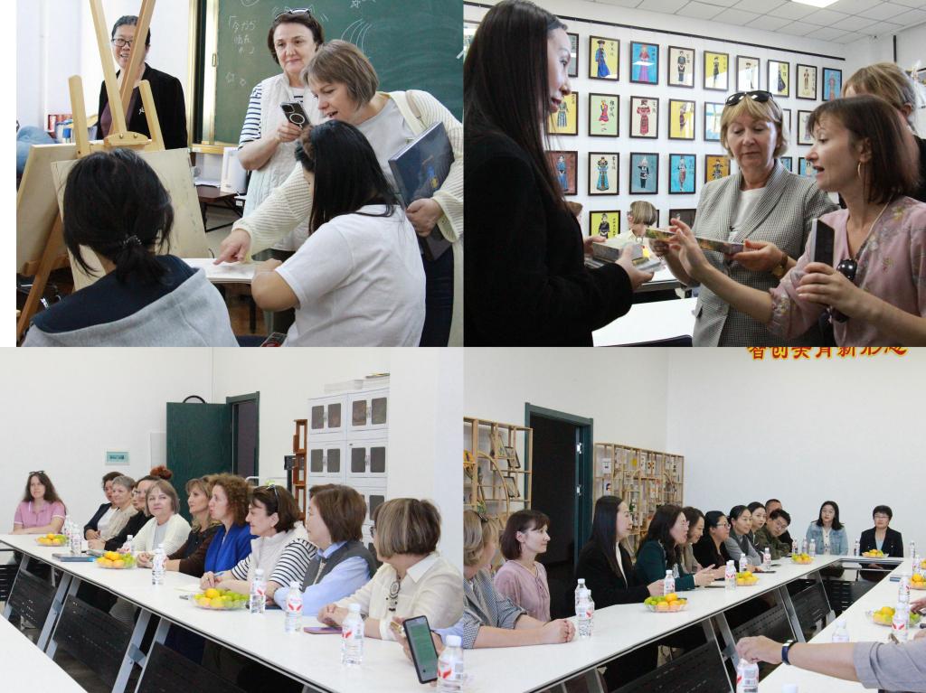 在实地考察过程中,代表团成员们首先参观了行知楼一楼的美育成果展区,听取了学前教育专业美育教育实践路径相关介绍,仔细观赏了学生们创作的各种艺术作品。在幼儿园情景模拟实训室、感统实训室、美术实训室及创客实训室,代表团与教育科学学院相关同志就游戏化教学、跨学科项目式学习、美育工匠传承特色模式等内容进行深入交流,对学院显示的各项成果给予肯定,认为该学院的教学理念与实践对俄罗斯本土教育改革极具借鉴价值。