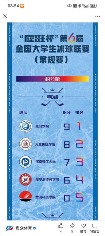 近日,"犀旺杯"第6届全国大学生冰球联赛甲B组(常规赛)在郑州落幕。学校北疆龙冰球队经过四轮激烈角逐,以三胜一负,积9分的优异成绩,勇夺甲B组常规赛冠军,成功晋级全国总决赛。