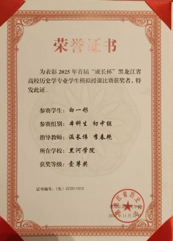 比赛分为初赛和决赛两个阶段,初赛采取网络评审,决赛邀请黑龙江省教师发展学院、哈尔滨市第三中学以及哈尔滨师范大学附属中学基础教育一线专家型教师现场评议。在决赛阶段,我校历史学专业白一彤同学以《七七事变与全民族抗战》课程的精彩讲授,荣获本科生组一等奖的佳绩。此次获奖不仅展现了我校历史学专业学子扎实的专业功底和良好的教学素养,也体现了学校在历史学人才培养过程中对实践教学的重视,为今后相关专业学生提升教学技能、积累授课经验提供了宝贵的交流平台。