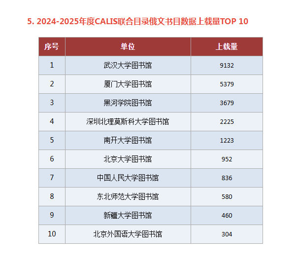 近日,中国高等教育文献保障系统(CALIS)联机合作编目中心发布2024-2025年度排行榜,我校图书馆俄文书目数据上载量荣获全国高校第三名。至此,我校已实现连续三年在该项排名中稳居全国前三。