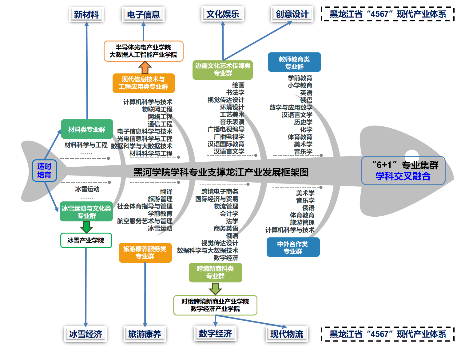 “十四五”时期,学校锚定国家向北开放战略、东北全面振兴及黑龙江省“4567”现代化产业体系建设需求,紧扣黑河市沿边开放发展定位,以系列国家级、省级教育政策为遵循,深化教育教学综合改革,推进专业集群化、内涵式发展。作为黑龙江省特色应用型本科示范高校培育单位,学校专业建设成效卓著,为特色应用型高校建设筑牢核心支撑,为龙江全面振兴提供坚实人才与智力保障。