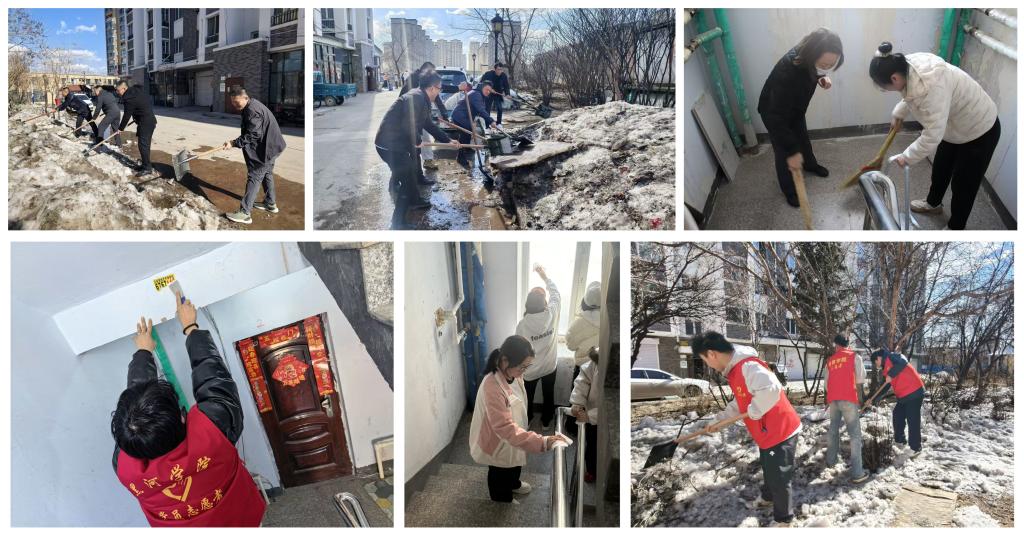 活动中,师生分工协作,对小区地面、楼道楼梯进行全面清扫,清理庭院内堆积杂物,并铲平清理绿化带积雪,以实际行动美化居住环境、改善卫生面貌。