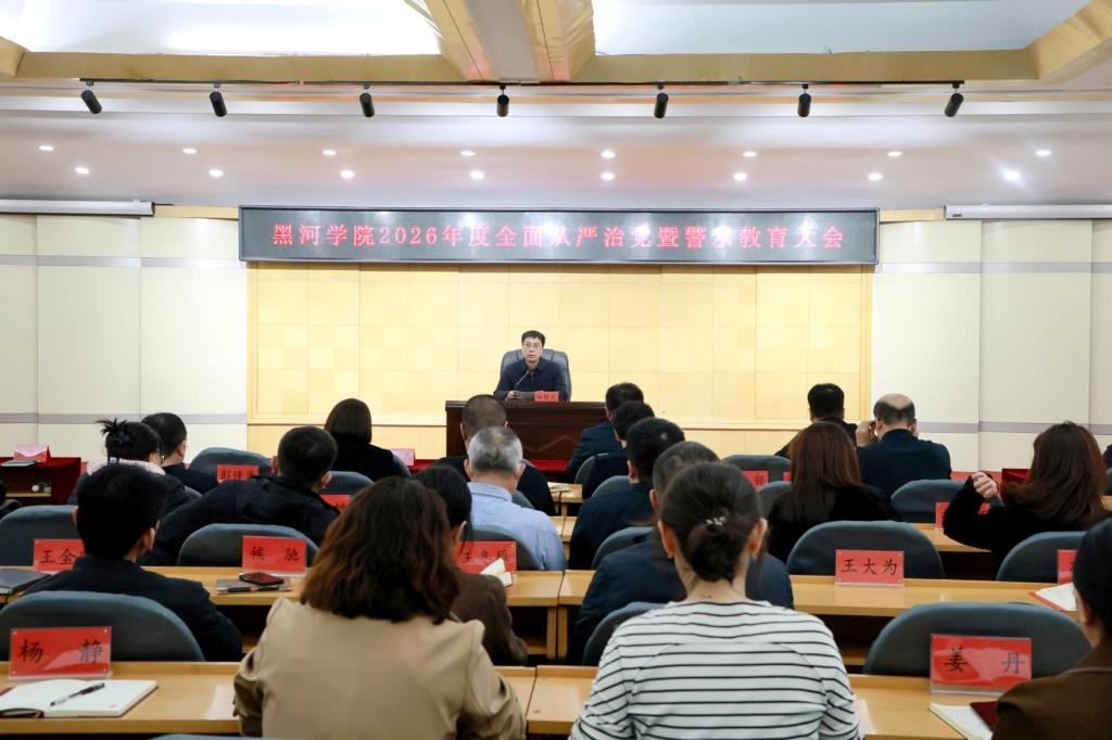 4月15日,学校召开2026年全面从严治党工作会暨警示教育大会。党委书记刘晓峰出席会议并讲话,党委副书记、院长杨敬民主持会议并传达教育部、黑龙江省委、省委教育工委有关会议精神,党委副书记、工会主席安全义部署学校深化教育领域腐败整治工作,党委委员、纪委书记、省监委驻黑河学院监察专员黄伟中同志作《纪委工作报告》并通报相关典型案例。