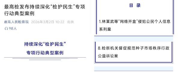 近日,最高人民检察院发布持续深化“检护民生”专项行动典型案例。其中,《检察机关督促规范种子市场秩序行政公益诉讼案》成功入选。该案由五大连池市人民检察院主办,我校文化旅游学院法学专业全程深度参与办理,充分彰显了我校在法学实践教学与服务地方法治建设方面的深耕笃行、行稳致远。