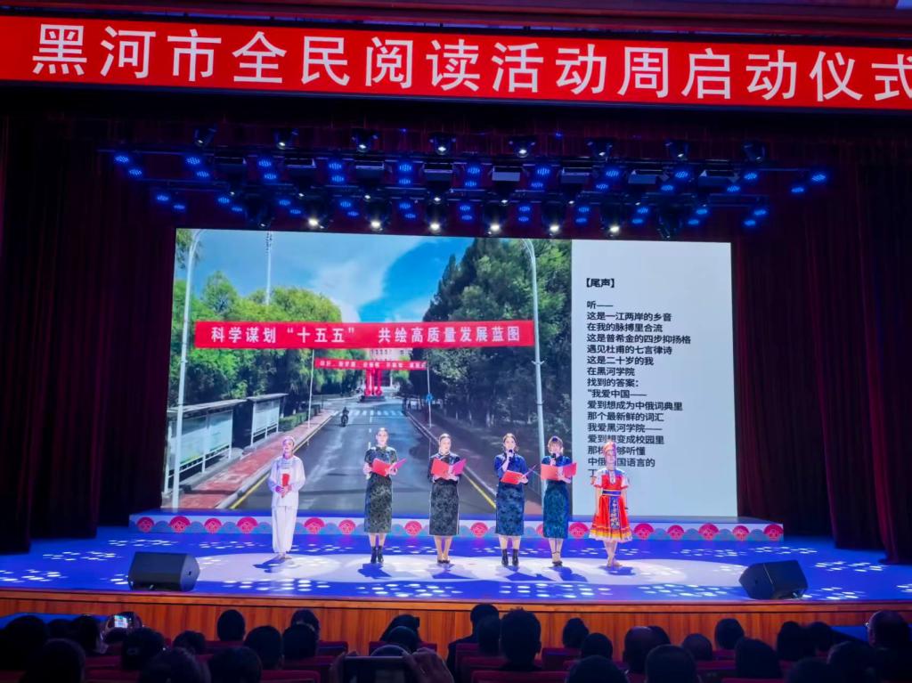 在“全民阅读活动周”暨中国黑河·俄罗斯布拉戈维申斯克阅读伙伴计划启动仪式上,我校国际教育学院留学生带来原创情景朗诵《真情告白》。留学生们以娴熟的中文朗诵为核心,搭配俄罗斯传统舞蹈、中国太极拳特色展示,用生动的文字诉说在校园的点滴感悟:“蘸着墨香的录取通知书、友谊楼温暖的教室、稻香园阿姨端出的红菜汤、校园里摇曳的丁香、天涯若比邻的赠言……还有学习剪纸、包粽子的美好体验”,将对中国文化的热爱与对校园生活的眷恋融入其中,生动展现了阅读与文化传诵的独特魅力,赢得现场阵阵掌声。