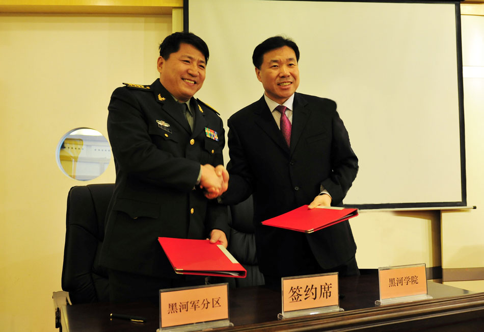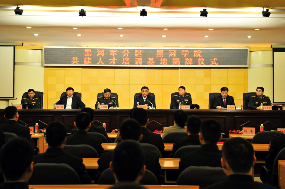 黑河军分区司令员吴明辉与黑河学院校长贯昌福共同签署《黑河军分区、黑河学院共建人才培训基地协议》。黑河军分区政委王和峰,黑河市委常委、宣传部部长姜福,黑河军分区副司令员刘士波,黑河军分区副政委王振兴,黑河学院党委副书记杨宏、李廷栋,副校长吕巧凤,黑河市教育局局长李国君,黑河市民政局副局长、双拥办主任刘录参加揭牌仪式。