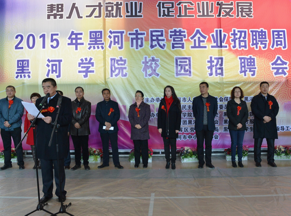 黑河市委组织部副部长、黑河市人力资源和社会保障局局长王喜军在讲话中表示,我国经济发展步入新常态后,非国有制经济已成为全市经济的重要组成部分,本次民营企业招聘周活动,顺应这一趋势,为促进用人企业和高校毕业生供需对接搭建一个有效服务平台。市人社局将本次招聘会作为2015年黑河市民营企业招聘周活动启动仪式的主会场,仪式结束后,将开展为期一周的招聘活动,促进更多高校毕业生实现更高质量就业。