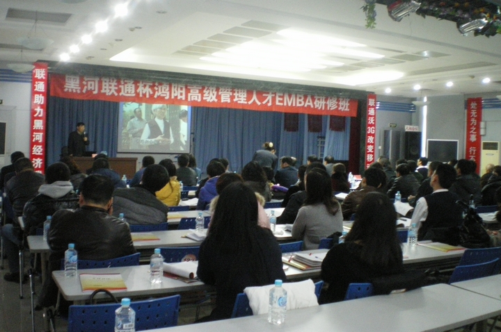 本网讯(记者 宁艳红)11月26日下午,由黑河鸿阳教育培训学校主办、黑河联通公司合办的高级管理人才EMBA研修班在联通公司六楼会议室开班,《百家讲坛•开国大典》主讲人江英教授作《毛泽东思想谋略及其应用》专题讲座,这次活动为黑河市政府领导、企事业中、高级管理者奉上一次思想盛宴,学院宣传统战部、团委及思想政治理论教研部骨干教师参加了专题培训。