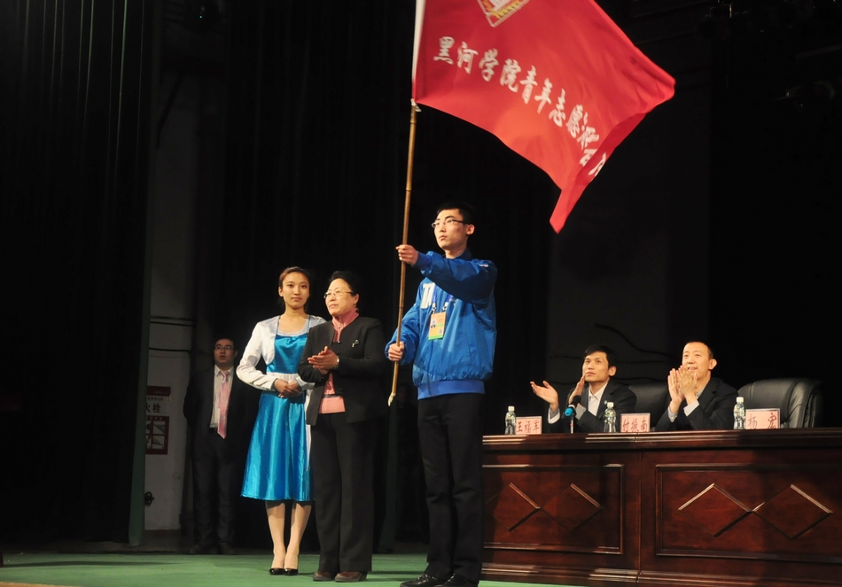 黑河学院党委副书记杨宏出席宣誓大会并为志愿者服务队授旗,黑河市委宣传部副部长、市文明办主任李思成,黑河团市委副书记付振南,黑河市文明办副主任詹大伟参加大会。