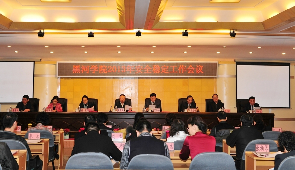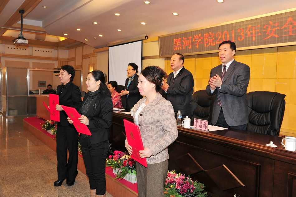 会上,学院党委书记曲伟建、院长贯昌福、党委副书记杨宏为获得2012年度安全稳定与社会治安综合治理工作的音乐系、英语系、数学系等先进单位进行了颁奖;院长贯昌福与各系(中心、部)、各部门签订了《黑河学院2013年安全、稳定、综治工作责任状》、《黑河学院2013年消防安全工作责任状》和《黑河学院2013年安全生产工作责任状》;学院党委副书记杨宏传达了省、市安全工作有关会议精神;副院长车永宏通报了黑河学院2012年度安全稳定与社会治安综合治理工作考核情况。