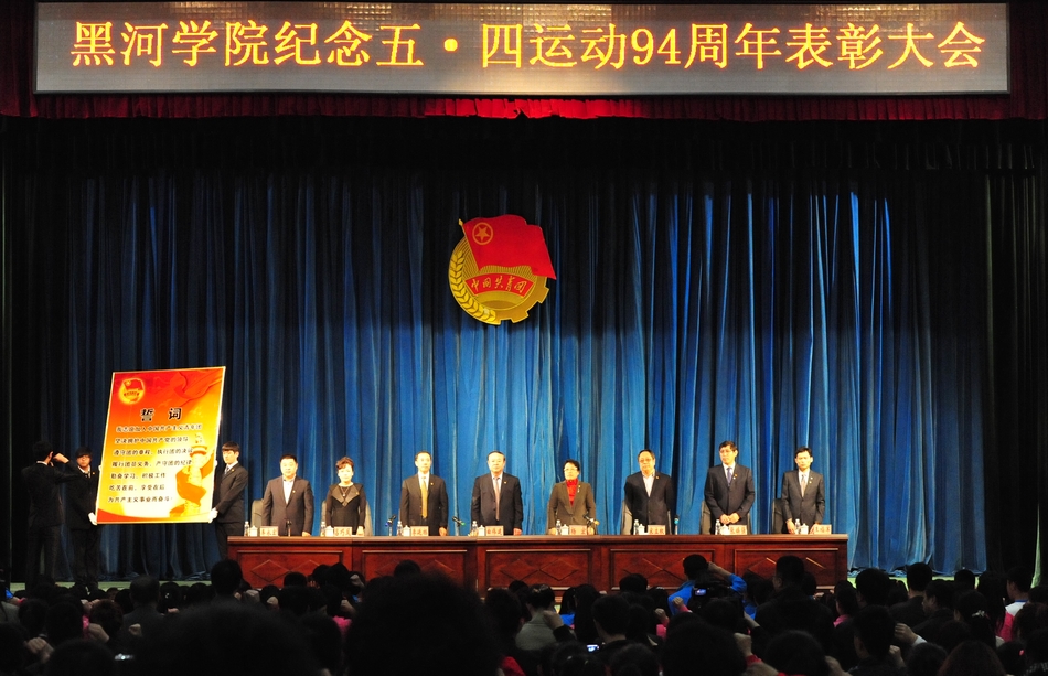 本网讯(特约记者 梁云婴 摄影 何振东 张维超)5月3日,黑河学院纪念“五·四”爱国运动94周年暨共青团组织创先争优总结表彰大会在礼堂举行,学院党委书记曲伟建,党委副书记杨宏、李廷栋,副院长宋立权、吕巧凤、张焕强、车永宏出席会议,各系(中心)党总支书记、团总支书记,部分师生代表参加表彰大会,大会由院党委副书记杨宏主持。