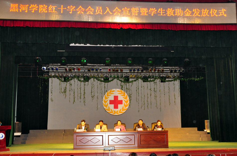 本网讯(特约记者 鄢占财 摄影 王佳)在第66个“5.8”世界红十字日来临之际,学院在礼堂举行了红十字会会员入会宣誓暨贫困学生救助金发放仪式。黑河学院党委副书记杨宏出席会议并作重要讲话,黑河市红十字会副会长黄福生、秘书长曹晶出席活动,学院学工部、团委负责人与师生代表近千人参加了活动。活动由学院团委负责人主持。
