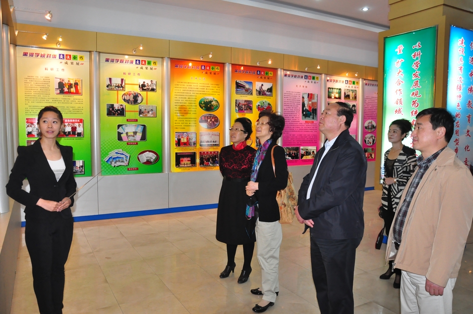 袁明教授一行在学院党委书记曲伟建,党委副书记杨宏,副院长车永宏的陪同下参观了学院对俄交流成果展厅、美术系展厅。