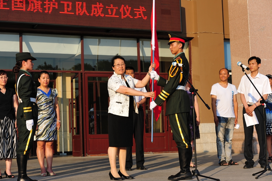 仪式上,学院党委副书记杨宏同志在仪式上发表了热情洋溢的致辞。她肯定了大学生国旗护卫队艰苦训练三个月来取得的成绩,向对护卫队成立付出辛劳的武警部队表示了衷心的感谢。党委副书记杨宏希望广大青年学子热爱国旗,积极践行爱国主义精神,增强国防观念,培育健康向上的校园文化氛围。党委副书记杨宏向38名国旗护卫队队员授予了“黑河学院国旗护卫队”队旗,标志着大学生国旗护卫队正式成立。