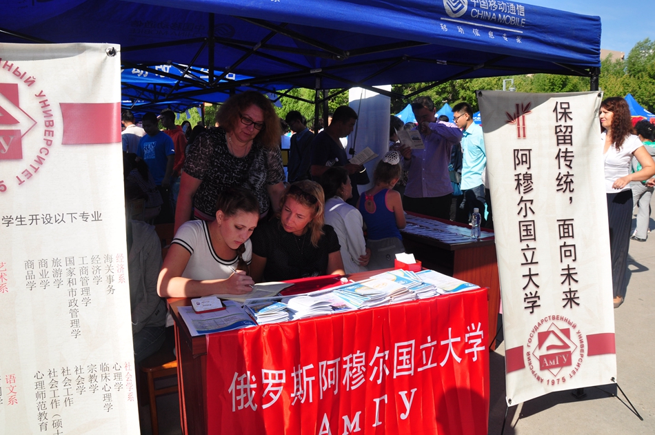 本网讯(特约记者 刘昱洁)9月7-8日,是黑河学院2013级新生报到的日子,虽然黑河市有了百年一遇的洪水,但没能挡住来自全国各地莘莘学子求学脚步。为让初到黑河学院的新同学能亲身体验到我校对俄交流特色,触碰俄罗斯文化,学校于9月6—8日邀请俄罗斯布拉戈维申斯克国立师范大学、阿穆尔国立大学和远东国立农业大学来我校举办推介会,旨在宣传俄罗斯学校的办学特点,传播俄罗斯民族文化。
