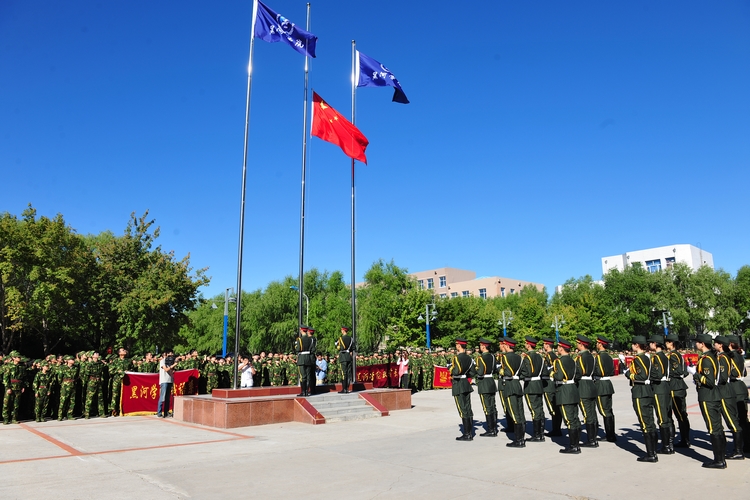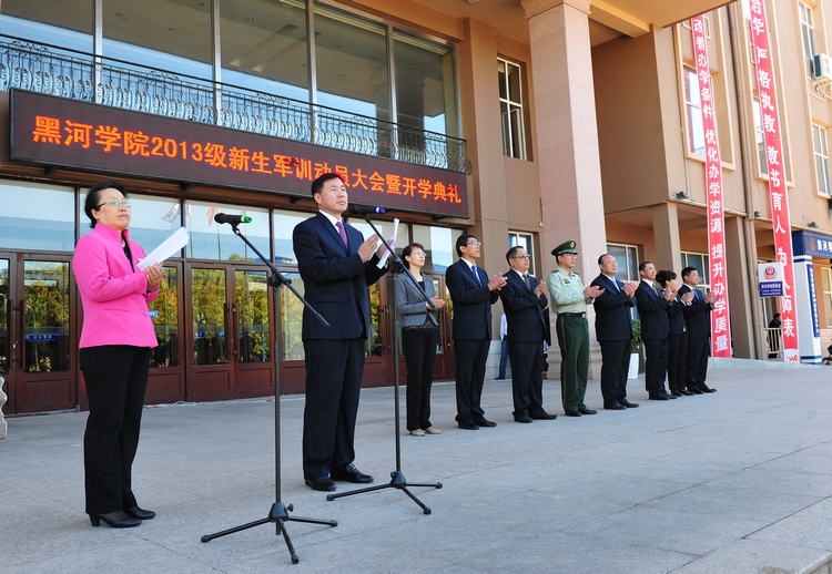 本网讯(特约记者张铎 摄影 何振东)9月11日上午,我院在明德楼前隆重召开2013级新生军训动员大会暨开学典礼。学院党委书记曲伟建,院长贯昌福,党委副书记杨宏、李廷栋,副院长宋立权、吕巧凤、张焕强、车永宏,总会计师宁艳杰和武警黑河市森林支队副政委谭洪波出席大会,会议由党委副书记杨宏主持。学院国旗护卫队迈着矫健的步伐,庄严地走向国旗台,动员大会在雄壮的国歌声中拉开帷幕。