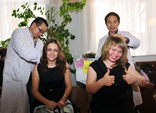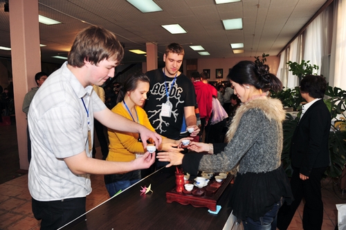 黑河学院师生们进行的武术表演,动作刚柔相济,让人赏心悦目,获得在场俄罗斯大学生的阵阵掌声,引起不少俄罗斯大学生争相学习模仿。在中医体验环节,黑河学院师生细心讲解中医知识和起居饮食、养生保健的正确方法,为俄罗斯师生做推拿、按摩等健康保健。交流活动不仅提升了武术、中医在俄罗斯的影响力,更增进了俄罗斯人民对中华文化的了解和认知。在茶艺展台,中俄师生不仅能够了解中国茶艺、品尝了中国茶,还从茶艺表演者的讲解中了解温壶、烫杯、装茶、高冲、盖沫等茶艺知识,体验中国茶艺文化的独特魅力。