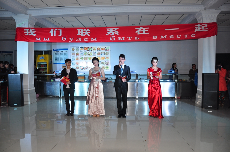 本网讯(记者 王佳 摄影 何振东 刘旭赢)10月24日晚,第四届“携手青春共享阳光”国际青年联欢晚会在黑河学院外事食堂隆重举行。中俄双方百余名师生载歌载舞,共庆交流活动。