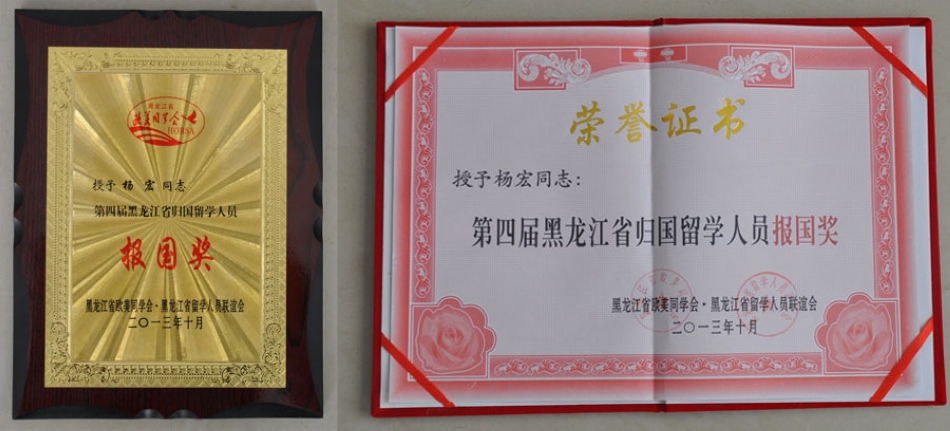 我院党委副书记杨宏喜获第四届黑龙江省归国留学人员报国奖;宣传统战部张巍获得2013年优秀留学人员工作者称号。我院副院长、欧美同学会会长车永宏的摄影作品《发现》被《我与欧美同学会会员绘画书法摄影作品集——纪念欧美同学会成立100周年》收录。