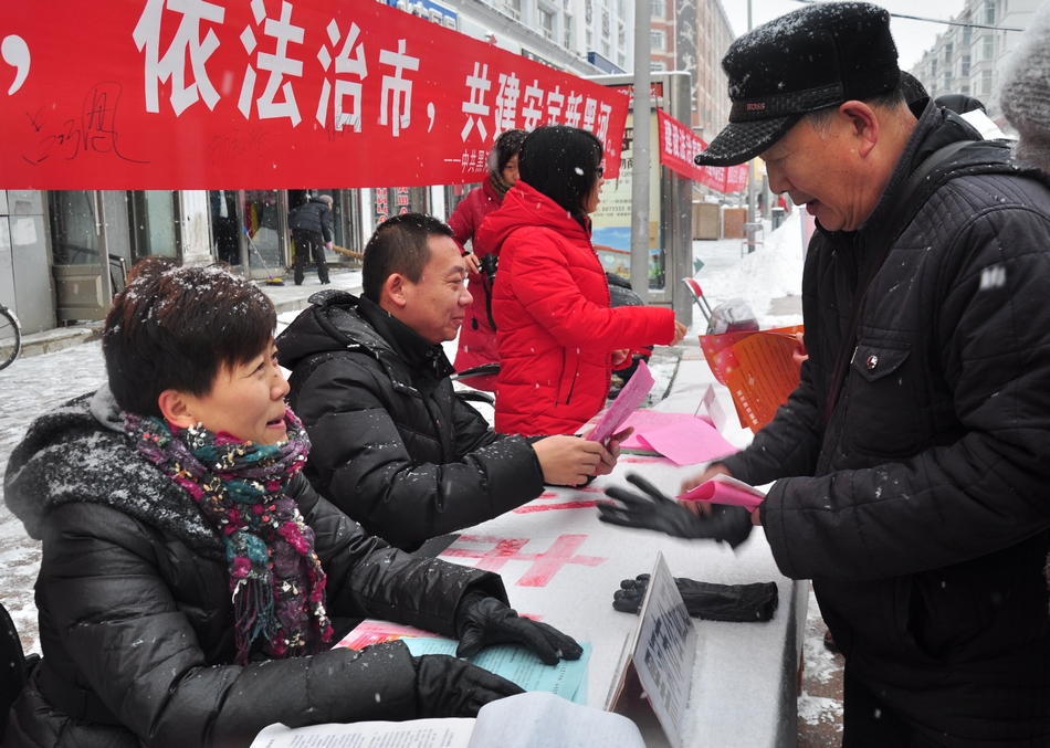 活动当天,我院历史文化旅游系学生会、法学专业学生与市委依法治市办、市司法局相关人员在华富商城附近和各社区设立了法律咨询宣传点,悬挂“法律进社区”宣传横幅,摆设了宣传展板,向市民发放与生产生活密切相关的法律法规宣传单,为广大市民解决家庭、生产、生活等相关方面的疑难纠纷提供法律咨询服务。虽然天气寒冷,飘着雪花,但学生们发放法制宣传单的热情未减,普法宣传志愿者解答群众咨询的态度未变。当一位市民咨询新修订的《机动车驾驶证申领和使用规定》及违法行为记分办法时,现场志愿者耐心细致地解答,受到居民群众的普遍欢迎。市民们纷纷表示,这样的法制宣传活动能够让百姓与法律工作者零距离对话,更好更全面地理解最新颁布的法律法规,学习法律知识,增强法治意识,希望这样的活动能够继续开展下去。