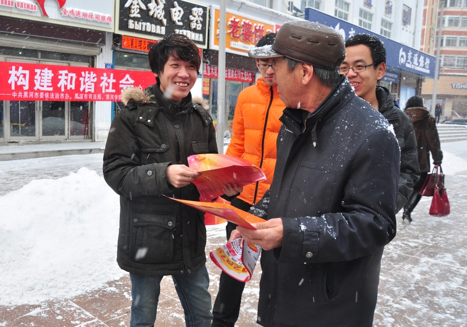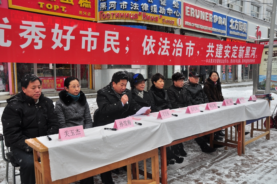 本网讯(记者 何振东)为深入开展“12·4”全国法制宣传日活动,推进“六五”普法规划的全面贯彻落实,12月4日,黑河学院党委宣传部、历史文化旅游系法学教研室、历史文化旅游系学生会与黑河市委依法治市办、黑河市司法局联合开展“法律进社区”宣传活动。黑河市政府副市长杨弘智,黑河市政协副主席张岭,黑河学院副院长吕巧凤等出席本次活动。