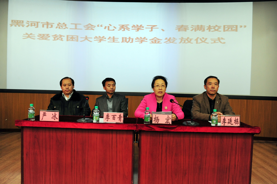 本网讯(记者 王佳)2月28日下午,由学院和黑河市总工会共同举办的“心系学子 春满校园”关爱贫困大学生助学金发放仪式在我院俄语楼举行。学院党委副书记杨宏、李廷栋;黑河市总工会副主席李百青、严冰出席会议。