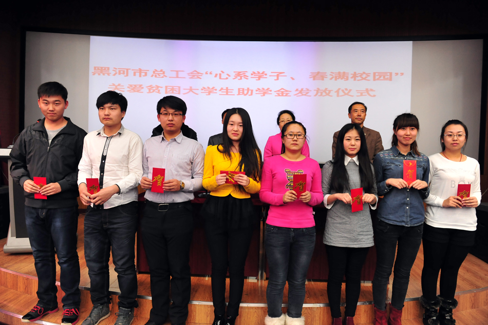 自2007年以来,黑河市总工会共筹集资金23.3万元对我院400余名贫困学生进行资助,今年爱心助学活动再次“起航”,市总工会筹集8万元善款,对我院80名贫困学生进行资助。