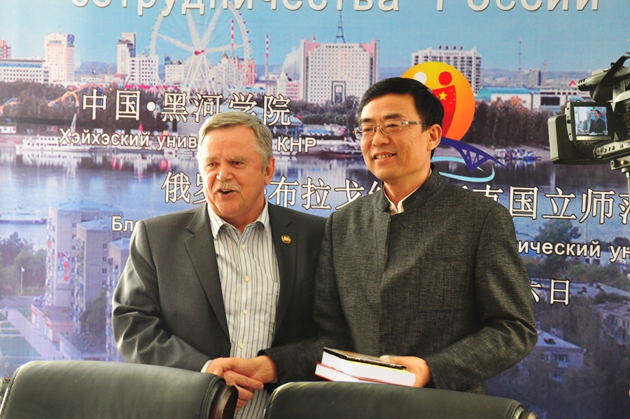 黑河学院党委书记曹百瑛代表我院致开幕词,表达了对中俄学者进校研讨的欢迎和良好祝愿,希望中俄学者在中俄教育合作和中俄区域发展发面达成更多的共识;他还简要回顾了我院与布拉戈维申斯克国立师范大学25年友好合作取得的成绩,希望中俄高校间的合作能 够不断拓宽领域,提升层次。布拉戈维申斯克国立师范大学第一副校长谢尔基延科Ю. П.向我院赠送了本校教师关于中国研究的著作及光盘。