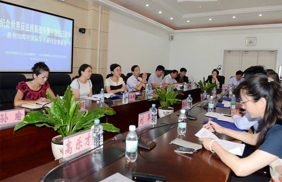本网讯(记者 王佳)2015年是世界反法西斯战争暨中国抗日战争胜利70周年,为隆重庆祝这一中华民族伟大胜利节日,8月23日由黑河学院历史文化旅游系与哈尔滨师范大学社会与历史学院联合主办的“纪念世界反法西斯战争暨中国抗日战争胜利70周年国际学术研讨会”筹备会在我院明德楼举行。