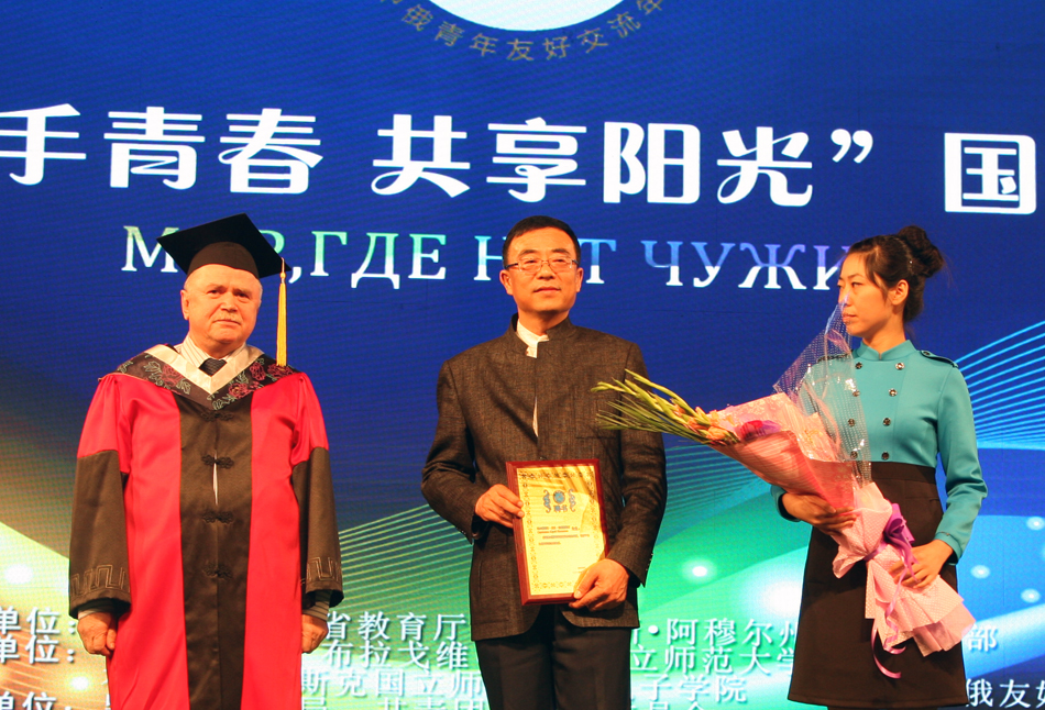 展演期间,学院党委书记曹百瑛为布师大前校长尤里颁发了黑河学院荣誉教授聘书;俄罗斯阿穆尔州教育部教育科学部代表亚古多夫.阿列克.米哈伊洛维奇代表阿穆尔州教育部向黑河市中俄友好协会赠送了中俄友好纪念品。展演活动在《相亲相爱》的歌声和经久不息的掌声中华彩落幕。