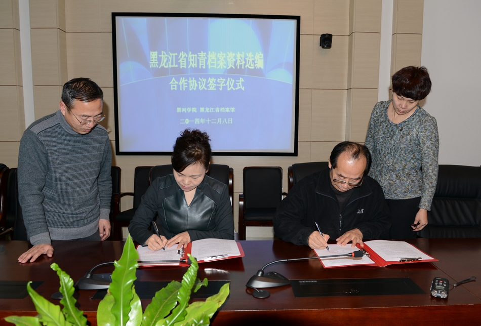 座谈会上,副院长吕巧凤与梁尔东副局长就编辑出版《黑龙江省知青档案资料选编》事项达成合作协议,并举行签约仪式。仪式结束后,双方就陈列馆建设以及在2015年举办“中俄联合纪念世界反法西斯战争70周年——在中国东北抗日战场主题展览”事宜展开了热烈讨论。