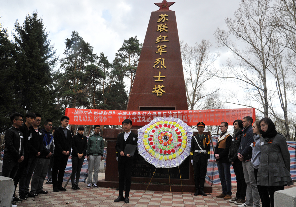 活动中,中俄大学生排着整齐的队列瞻仰了苏联红军烈士纪念碑,中俄学生代表共同向革命烈士敬献花圈,整理挽联,伫立默哀,向为世界和平和中国东北解放献出生命的苏联红军战士,深深三鞠躬,缅怀他们勇于献身的伟大精神。
