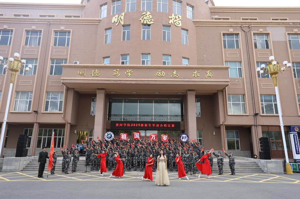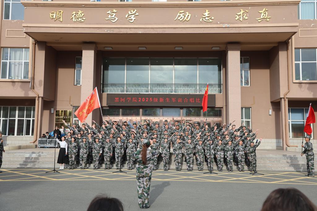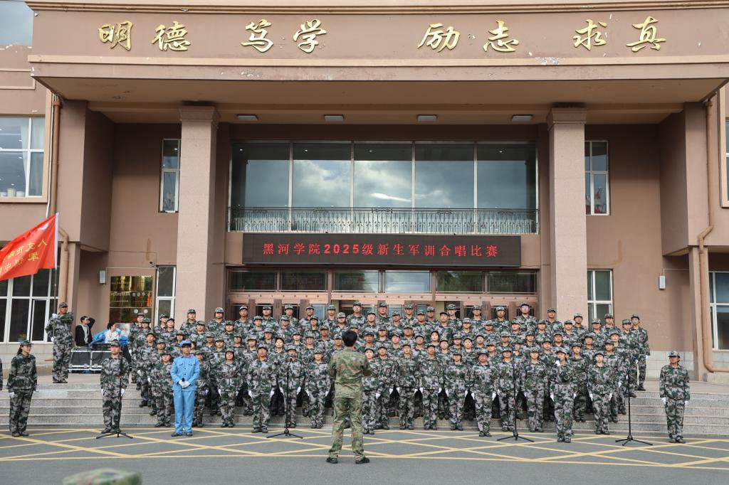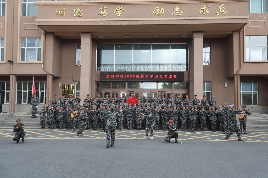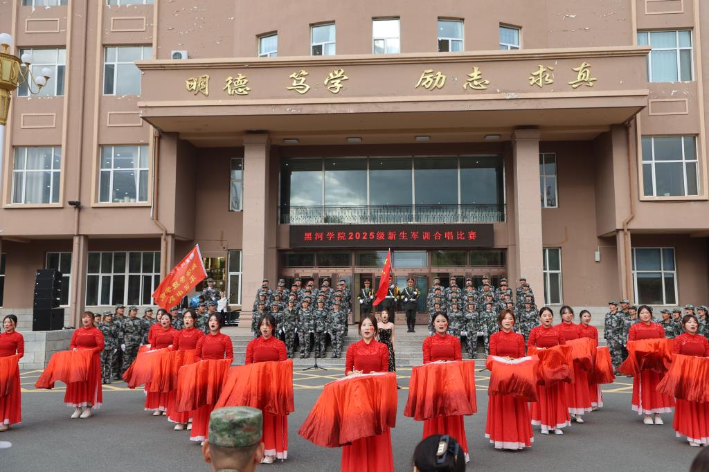 本次比赛以《黑河学院校歌》为固定曲目,各参赛队伍另选一首军旅主题歌曲作为自选曲目。各队依次登台,深情演绎了《祖国不会忘记》《走向复兴》《强军战歌》等多首经典歌曲,展现出强烈的集体荣誉感与深厚的爱校情怀。激昂的旋律与真挚的歌声,既表达了对革命历史的崇高敬意,也传递出新时代北疆学子爱国荣校、笃学力行的价值追求。整场比赛不仅是一场精彩的视听盛宴,更是一堂生动的思政公开课,实现了爱国主义教育与校园文化建设的有机融合。