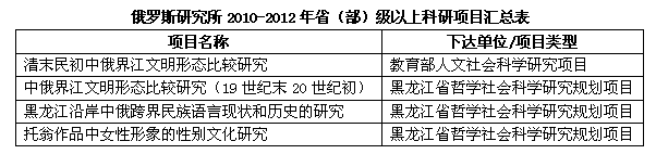 研究成果:截至2012年,研究所共承担教育部人文社会科学研究项目1项、省哲学社会科学研究项目3项,省教育厅人文社科研究项目3项,院级课题8项,参与省(部)级以上课题多项;公开发表学术论文60余篇;编写、出版了《俄罗斯国情文化精萃》、《阿穆尔经济地理》、《俄(苏)与外蒙古关系研究(1911—1945)》、《中俄关系通史》、《东北亚国际关系专题研究》等专著、教材。多项研究成果被转载或获奖,其中研究报告“中俄师范教育比较研究”获黑龙江省第十三届社会科学优秀科研成果佳作奖,论文“论俄(苏)的中国东北史研究”获黑龙江省第十四届社会科学优秀科研成果三等奖,译著“俄语常用动词词典”获黑龙江省第十五届社会科学优秀成果三等奖,专著《俄(苏)与外蒙古关系研究(1911—1945)》获黑龙江省第十五届社会科学优秀成果佳作奖。