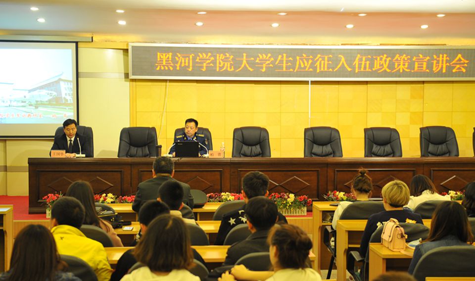 本网讯(特约记者 梁策 摄像 赵宇 刘思佳)为做好我校2016年征兵工作,按照黑龙江省教育厅、省军区的文件要求,4月20日下午,学校邀请空军哈尔滨飞行学院柏青大校来我校作了2016年征兵政策宣讲,开启了我校2016年征兵工作的序幕。爱辉区区委常委人武部政治委员李会上校和我校200余名学生参加了宣讲会。宣讲会由学生工作部(学生处)·武装部副部长王国华主持。