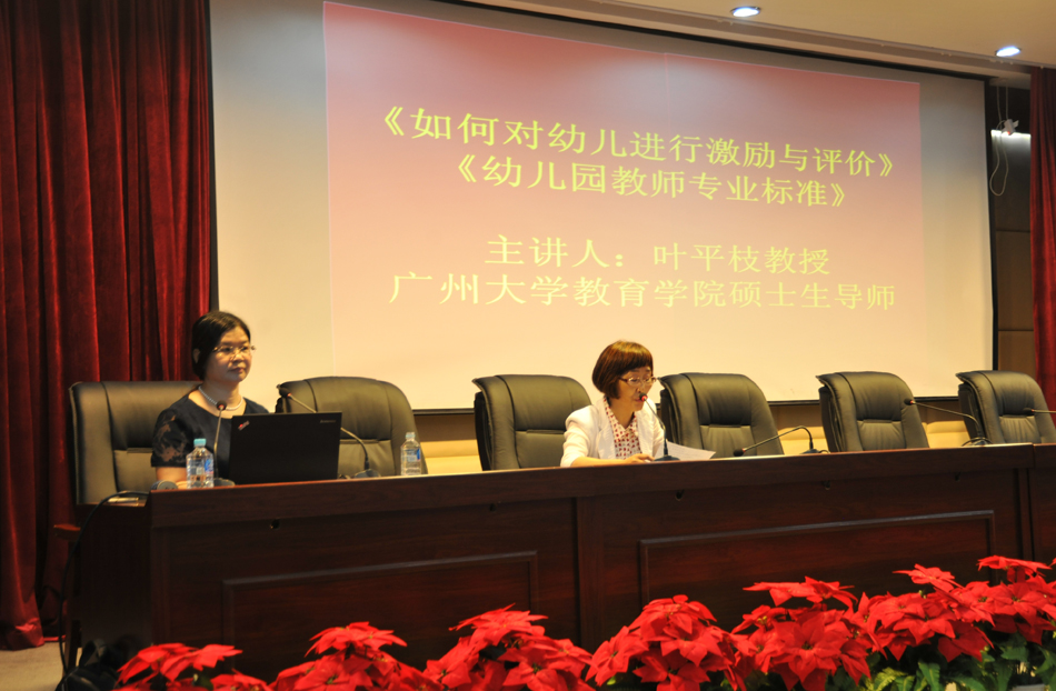 本网讯(特约记者 孙红 摄影 胥涵)7月12日下午,广州大学教育学院学前教育系主任叶平枝教授应邀我校学生作了题为“《如何对幼儿进行激励与评价》《幼儿园教师专业标准》解读”的学术报告。报告由教育科学学院刘颖主持。
