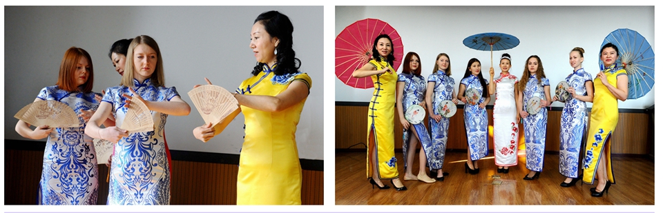 摆步、下蹲、站立……在黑河市爱辉区时尚民族服饰表演艺术团老师的指导下,留学生们身着印有青花瓷刺绣的长装旗袍、手拿古色古香折扇和色彩各异的油纸伞,学习体验中国传统服饰文化,尽显中国风与礼仪美。俄罗斯留学生塔季雅娜说:“旗袍作为中国的经典服饰,我一直很期待能穿上它,今天终于如愿以偿,我要将它穿出‘中国味道’。”