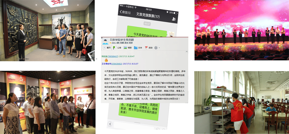 在做好“七个一”规定动作之外,学校各党总支结合工作实际,创新“自选动作”,积极探索“主题党日+”制度。在“主题党日+精准扶贫”活动中,学校领导前往老年公寓,看望退休老党员,与贫困师生党员座谈,了解他们家庭的基本情况,帮助他们解决实际困难;在“主题党日+红色经典教育”活动中,人文传媒学院举办以“缅怀先辈,讴歌时代,无私奉献”为主题的纪念活动,新老党员演唱红色歌曲,诵读红色经典诗歌,回顾中国共产党力挽狂澜的奋斗历程,深刻体会先辈们崇高的革命信仰,充分发挥红色经典教育人、引导人、鼓舞人和激励人的作用;在“主题党日+学党章知识竞赛”活动中,理学院党总支以赛促学,通过专题学习、专题辅导、专题交流、专题测试,掀起学习《党章》《准则》和《条例》的热潮,让党员们对新时期党员干部的纪律和规矩意识有了更深刻的认识,使党员们进一步增强政治意识、大局意识、核心意识和看齐意识;在“主题党日+志愿服务”活动中,美术与设计学院党总支组织学生党员到敬老院进慰问演出,到黑河市图书馆义务劳动,引导党员在关爱空巢老人和公益服务等方面发挥先锋模范作用,增强党员的责任感、使命感和荣誉感;在“主题党日+慰问短信”活动中,文化旅游学院党总支在7月1日当天向全体党员发送了“七一”慰问短信,鼓励全体党员不忘初心、不畏困难,充分发挥共产党员先锋模范作用,以实际行动促进教学、科研、学生管理等各项工作稳步推进。