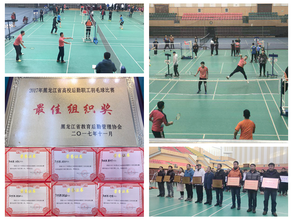本网讯(特约记者 马墨楠)11月23日至24日,2017年黑龙江省高校后勤职工羽毛球比赛在齐齐哈尔大学体育馆举行。我校后勤管理处选派7名职工组成的代表队参加比赛,经过两天的激烈角逐,王守文、马宝发获青年组男子双打比赛第二名,马宝发获青年组男子单打比赛第二名,黑河学院获“最佳组织奖”。