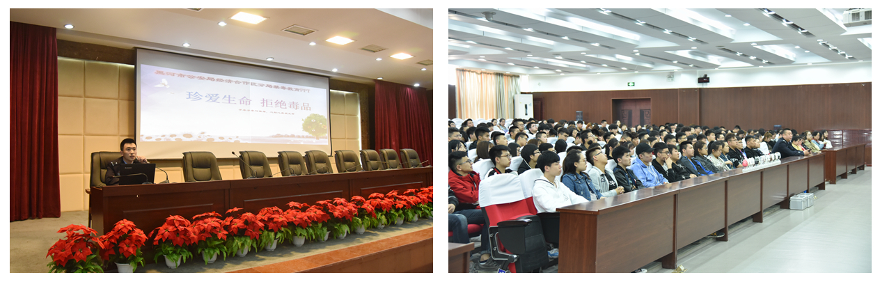 本网讯( 学生记者 张子腾 贾春杨 摄影 李雪 任宇)为进一步普及毒品防范知识,提高我校师生对毒品危害的认识和自我保护能力,4月18日下午,我校特邀黑河市公安局经济合作区分局禁毒部门民警杨森作“珍爱生命拒绝毒品”禁毒知识讲座。