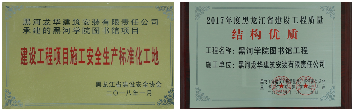 本网讯(特约记者 刘璐)在6月25日召开的黑河市工程质量——安全标准化会议上,黑河市城乡建设局党委书记、局长郑一俭通报2017年度获得省级优质工程的项目单位,我校图书馆是黑河市区唯一获得“省级结构质量优质工程”及“建设工程项目施工安全生产标准化工地”两项殊荣的工程项目,郑一俭局长代表“黑龙江省建设工程质量龙江杯评审委员会”“黑龙江省建筑业协会”和“黑龙江省安全协会”向黑河学院图书馆项目颁发荣誉证书。