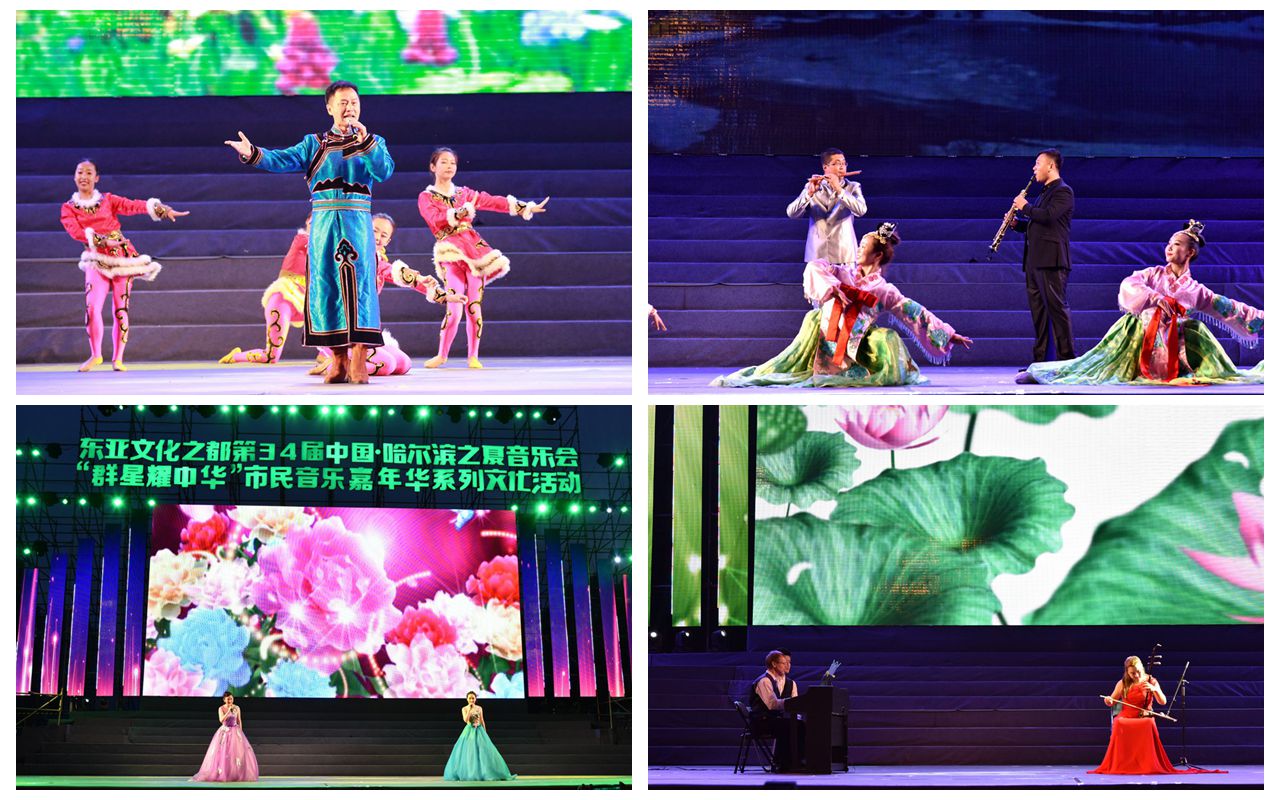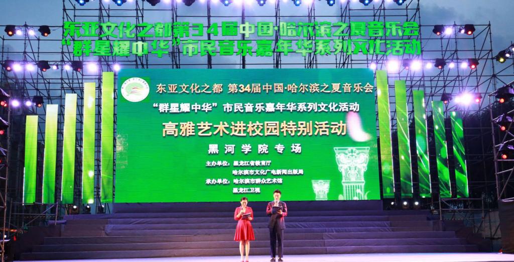 本网讯(记者 赵宇 摄影 宋国旺)展示东亚文化之都无限魅力,为第34届“哈夏”音乐会助力添彩,7月12日晚,第34届中国·哈尔滨之夏音乐会“群星耀中华”市民音乐嘉年华系列文化活动黑河学院专场演出在中央大街防洪纪念塔广场举行。本次活动作为黑龙江省教育厅高雅艺术进校园特别活动,由黑龙江省教育厅、哈尔滨市文化广电新闻出版局主办,黑龙江卫视、哈尔滨市群众艺术馆共同承办,引起社会各界广泛关注。省教育厅艺体卫处处长李向东到现场观看演出。我校党委书记王刚陪同哈尔滨体育学院党委书记曹百瑛(原黑河学院党委书记)、哈尔滨石油学院党委副书记杨宏(原黑河学院党委副书记)与现场近万名观众一同欣赏了具有中俄风情的音乐盛宴。